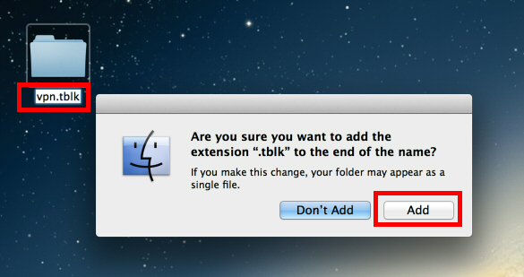 次に、デスクトップ上にある「Empty Tunnelblick VPN Configuration」という名前のフォルダの名前を「任意の名前.tblk」に変更します。
