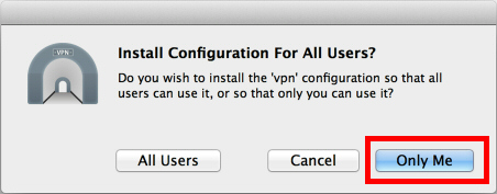 作成された「vpn.tblk」フォルダをダブルクリックすると、下図のような画面が表示されますので、「Only Me」をクリックしてください。